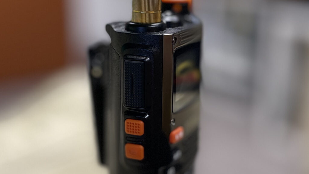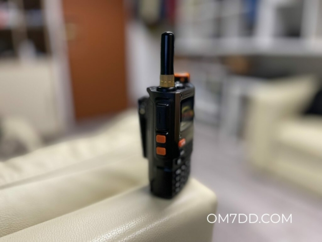 The radio is made of durable plastic and the front frame protecting the display is made of metal. It looks really good. On the top of the radio is a large rotary potentiometer that turns the radio on and adjusts the volume. Right next to it is a diode that serves as a portable light source. The antenna connector is a classic Baofeng SMA. There are three buttons on the side, the main button is PTT and right below it are two programmable buttons.